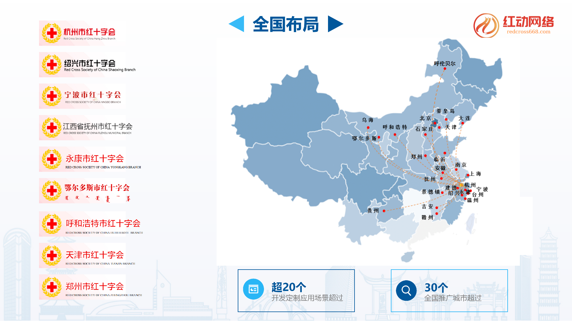 包括红十字会,民生单位,应急单位以及工会等政府企业,全国布局30多个省市,定制开发场景超20个,获的著作证书超35个。